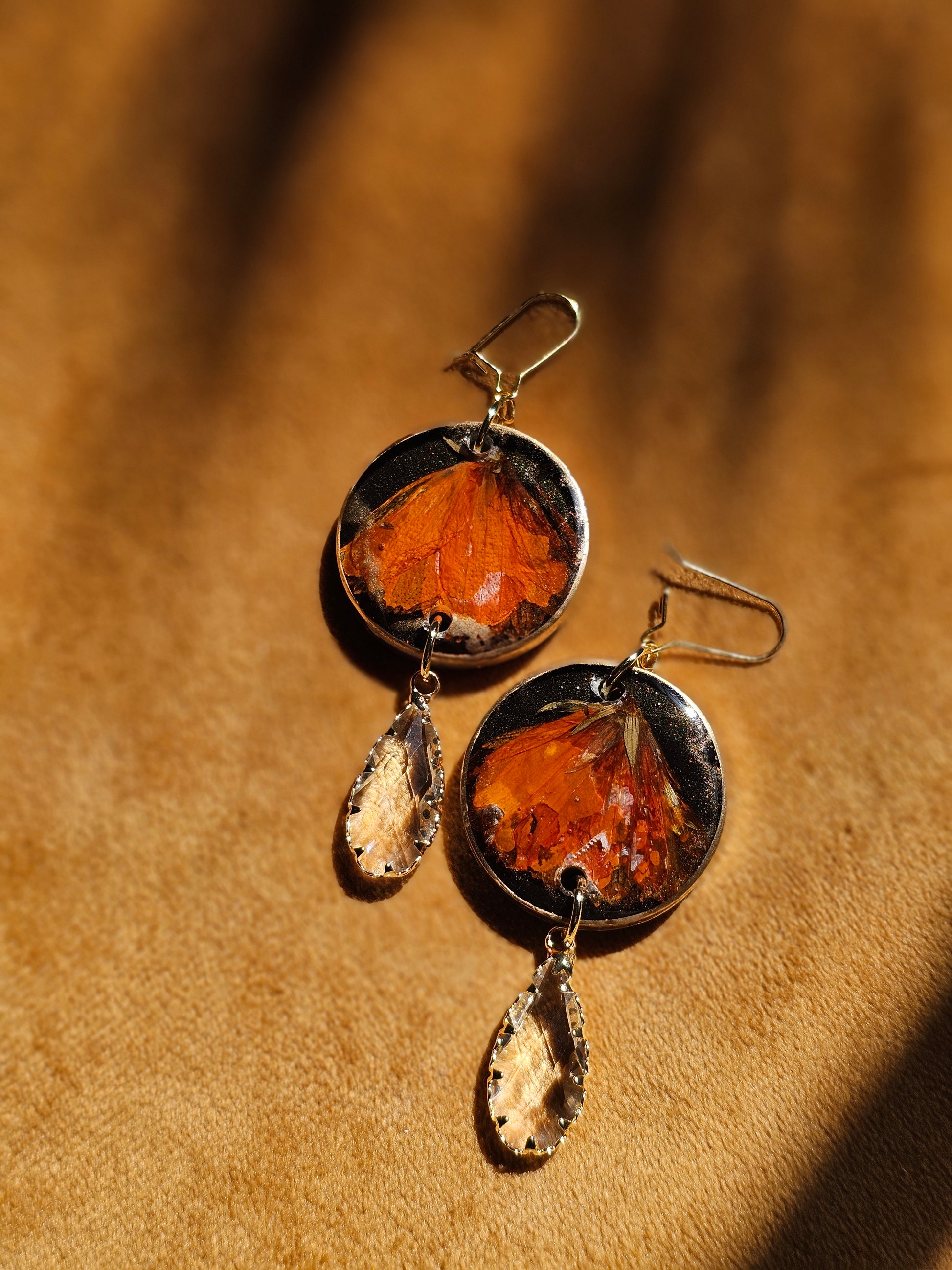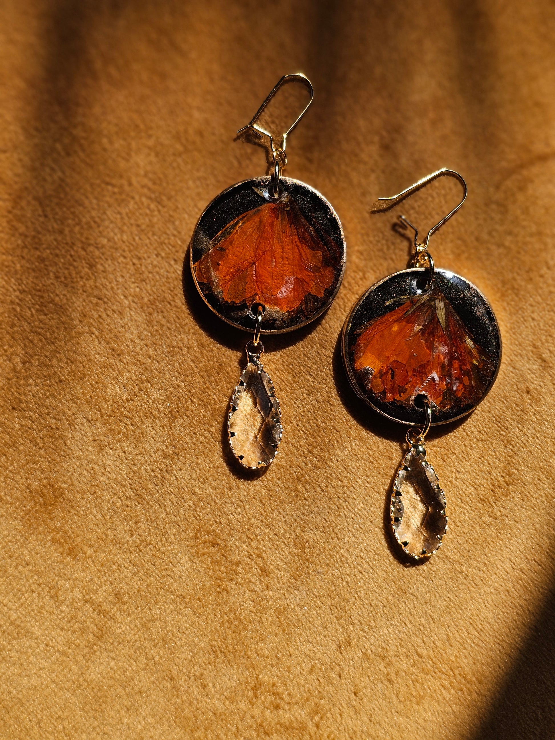 Real preserved chrysanthemum cast in epoxy resin finished with crystal tear drops and gold edges