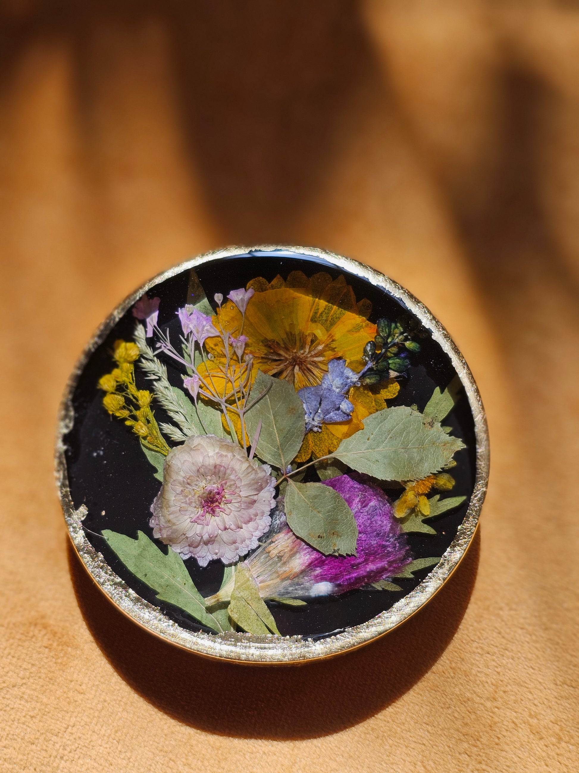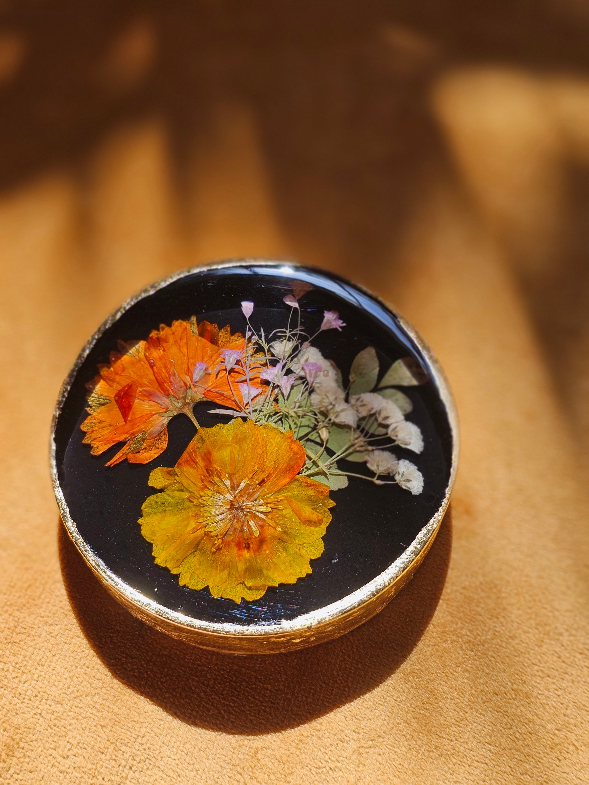 Preserved real flowers cast in epoxy resin and finished with gold foil edges